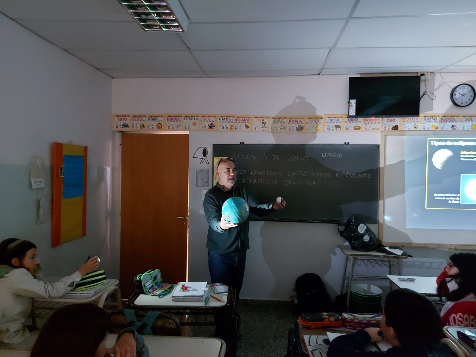 Les comentamos que comenzamos con la actividad del mensaje por celular. Lo que nos permitió darnos cuenta que no asociaban el contenido con ningún fenómeno real. Luego, Marcelo nos brindó la primera charla, en la que los vimos entusiastas con el tema y lograron evacuar algunas dudas y hablar sobre algunas curiosidades culturales en torno al tema. Continuamos con la lectura e interpretación de los eclipses. Pueden observar las fotos de lo que colocaron.