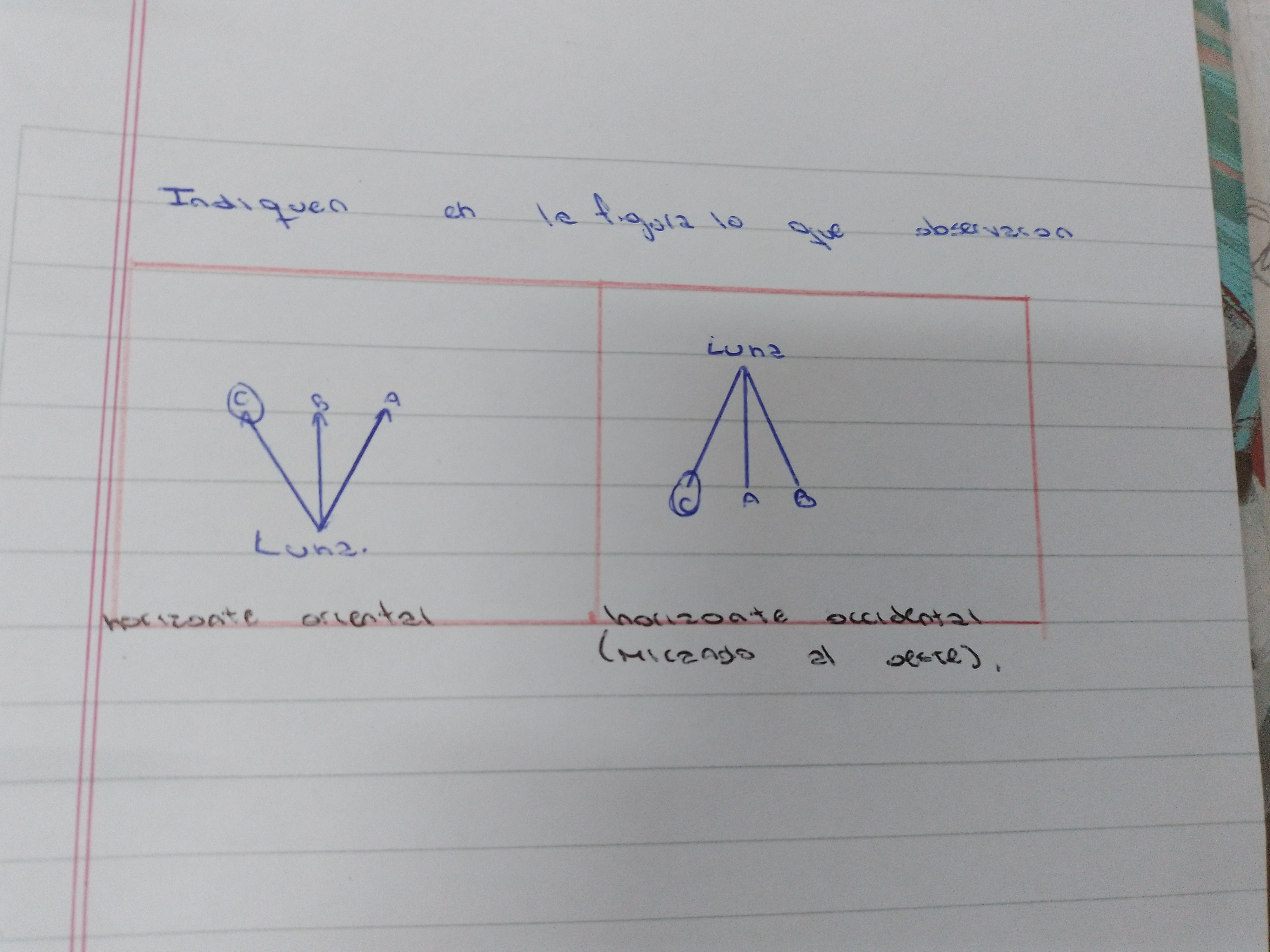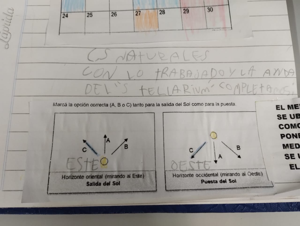 Buenas noches , colgué la actividad en la parte inicial, pero agrego a este espacio que además de utilizar en la observación de la Luna y el Sol la fotocopia , hicimos una actividad donde identificamos los puntos cardinales en cada espacio del aula , para este momento les pedí que se separaran en cuatro grupos y que identificarán que elementos veían dentro del aula en cada punto cardinal para tener como referencia. Luego pegamos cada cartel con los elementos que habían anotado. Para identificar el ascenso y descenso puse las flechas pegadas en grande en el aula con las letras A-B-C y en paralelo utilizamos el Stellarium . Estuvo muy emocionante escucharlo y ver que pensaban ellos/ellas de esto que observamos.