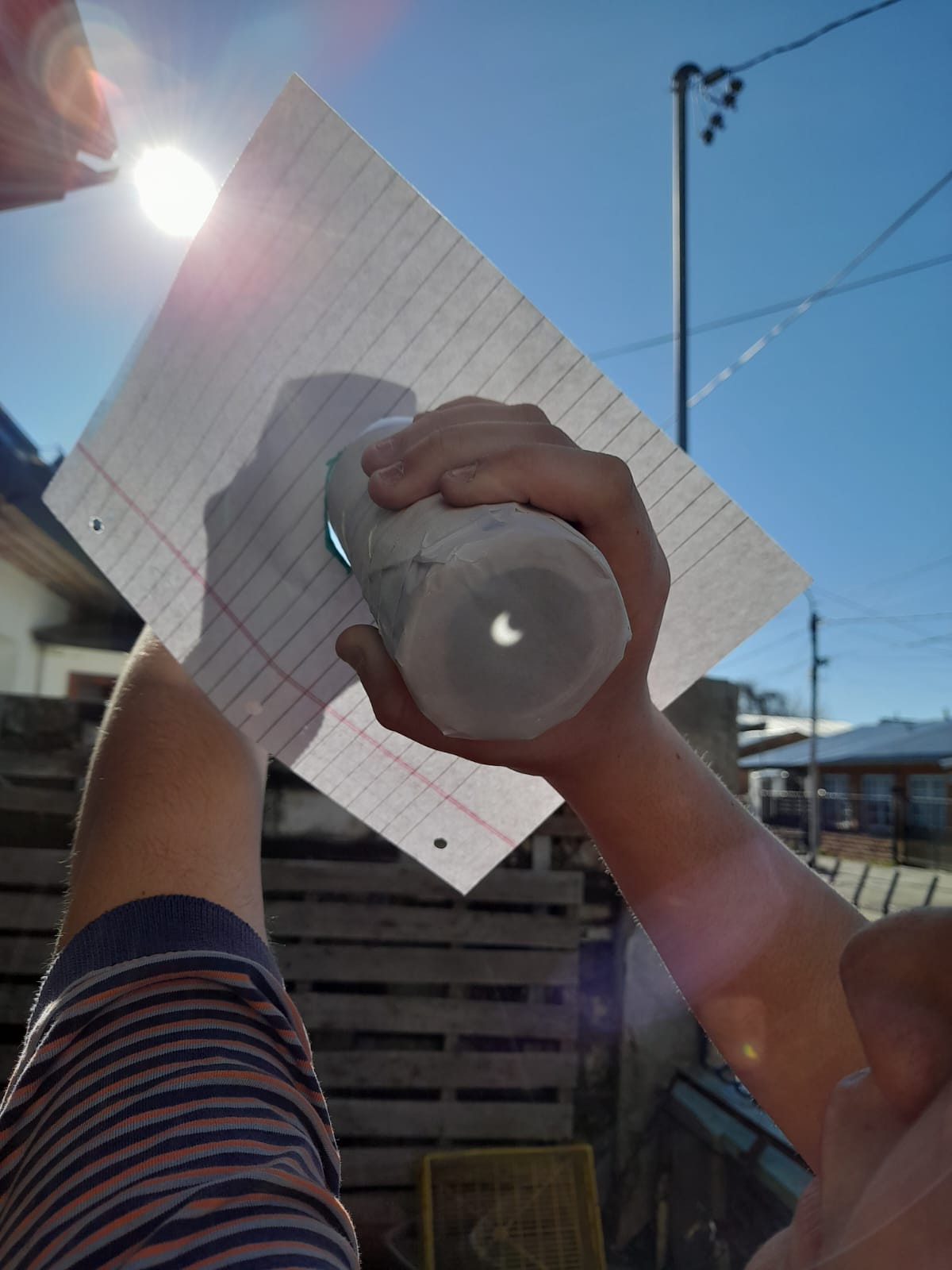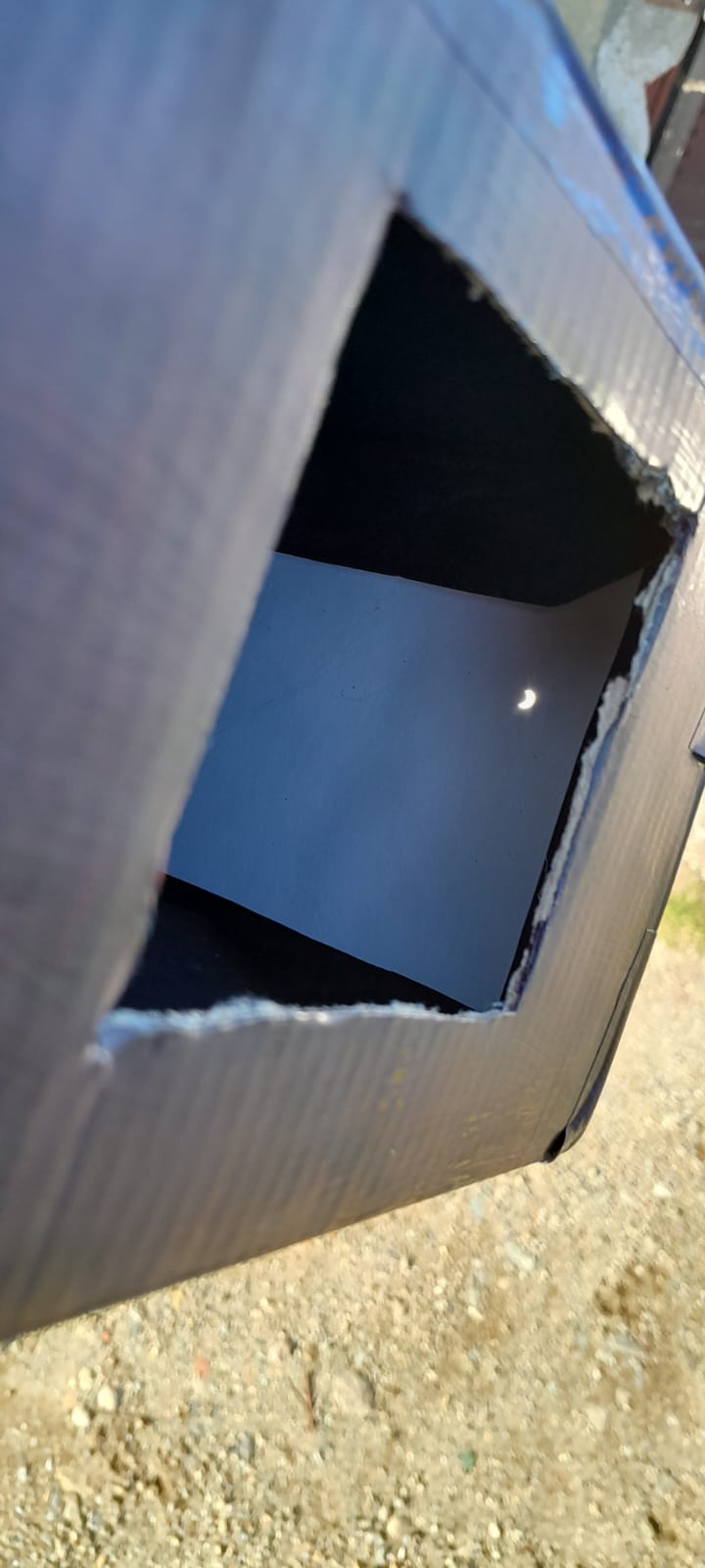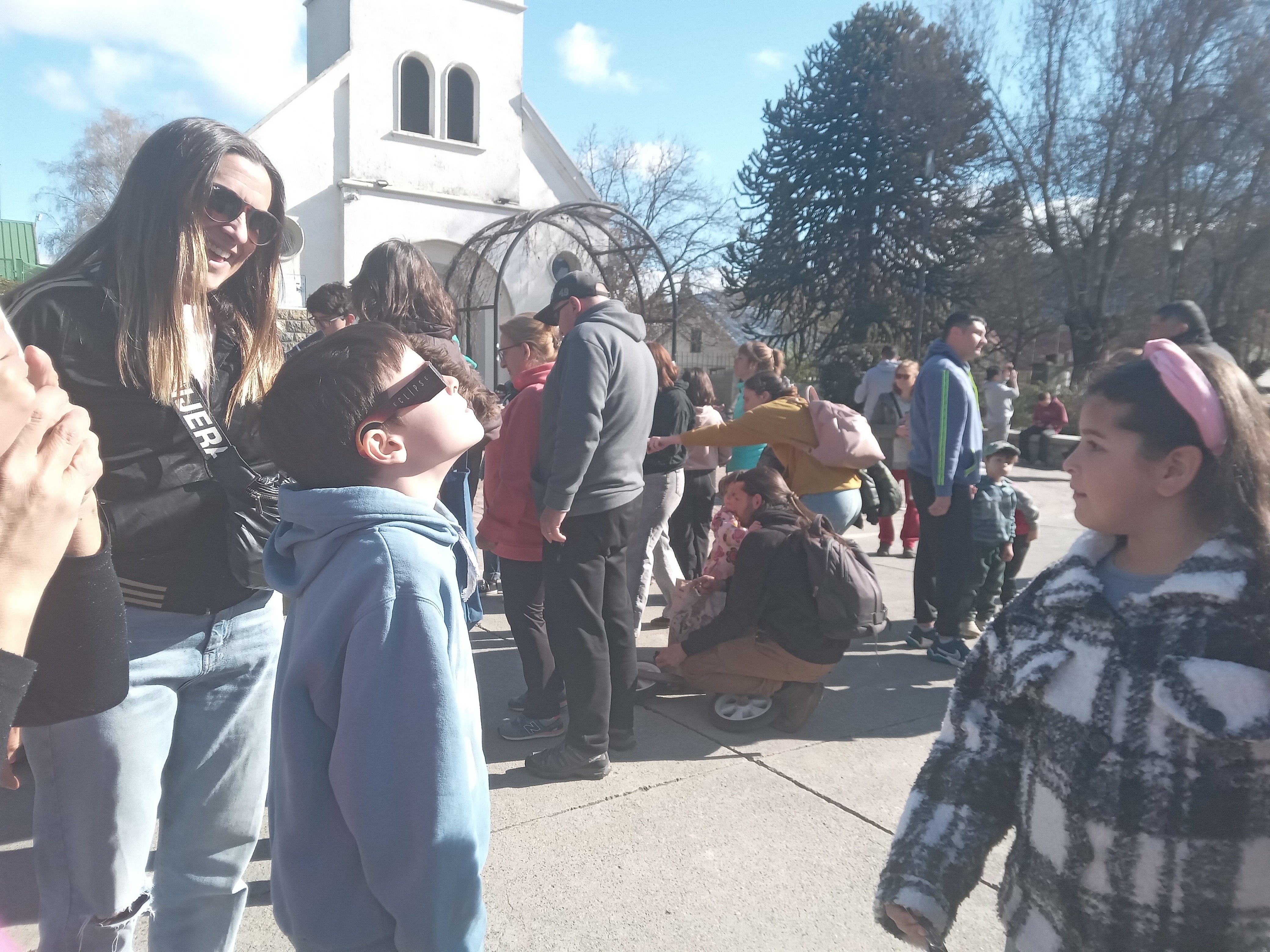 Hola buenas noches, aquí les comparto fotografías de la observación del eclipse, frente a la peatonal de la iglesia de la localidad de El Bolsón, donde se encontraban los chicos y chicas de Osiris. Allí se hicieron presentes los estudiantes de 2° turno mañana , Escuela N° 270. previo a la observación del eclipse, trabajamos en el aula las actividades de la guía, construimos nuestras cámaras oscuras, se fijo el vidrio de soldar sobre un cartón para una mayor seguridad a la hora de manipular el vidrio.