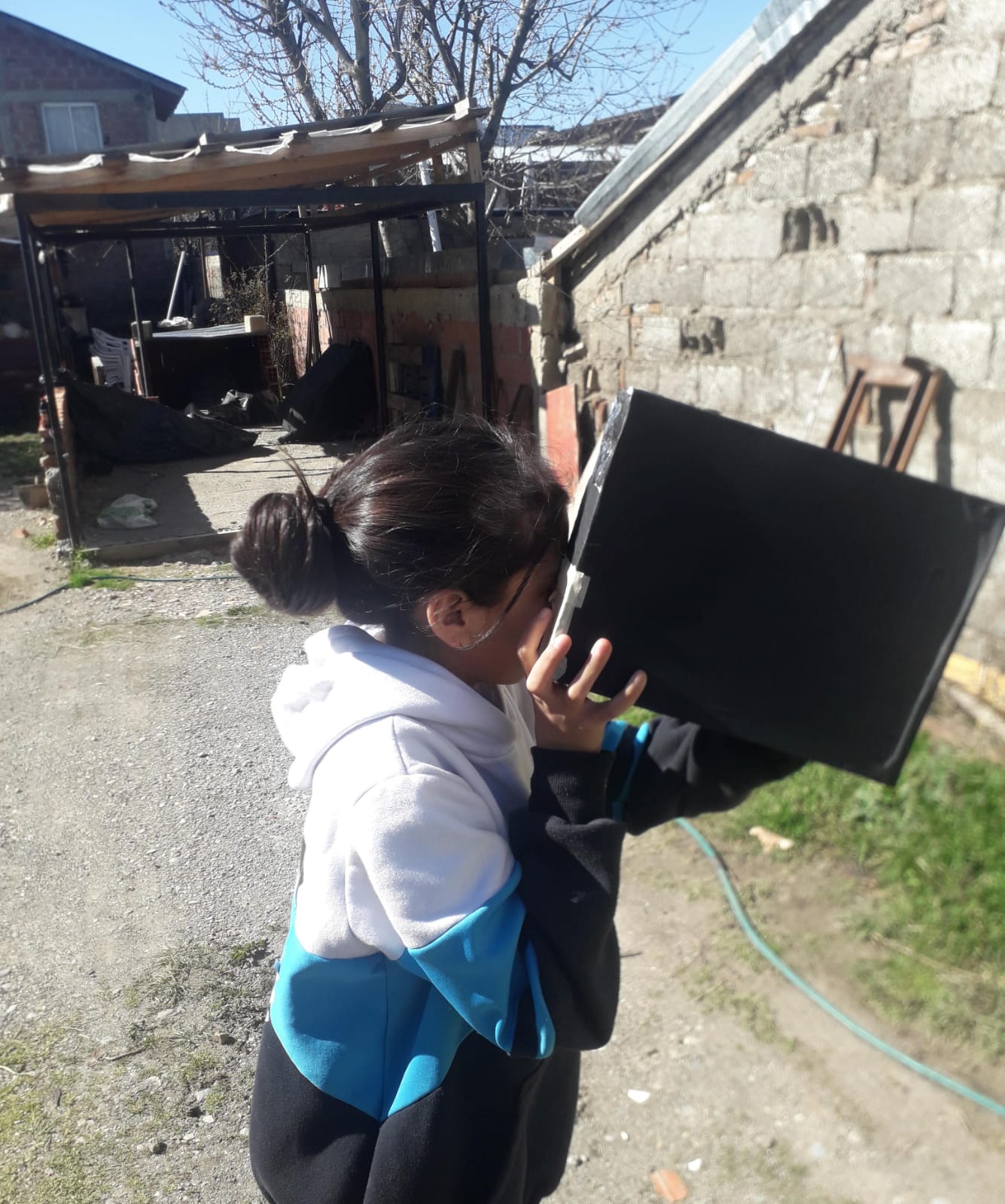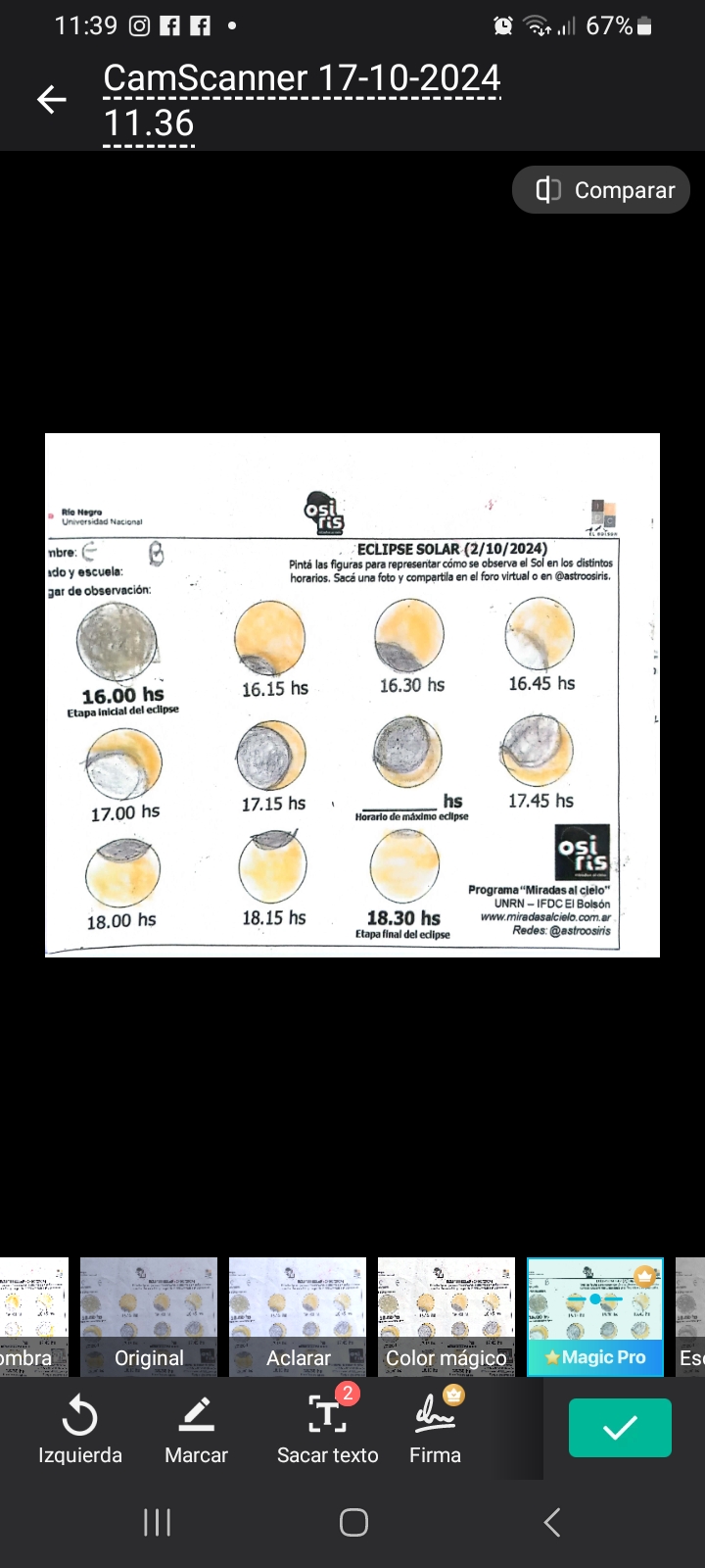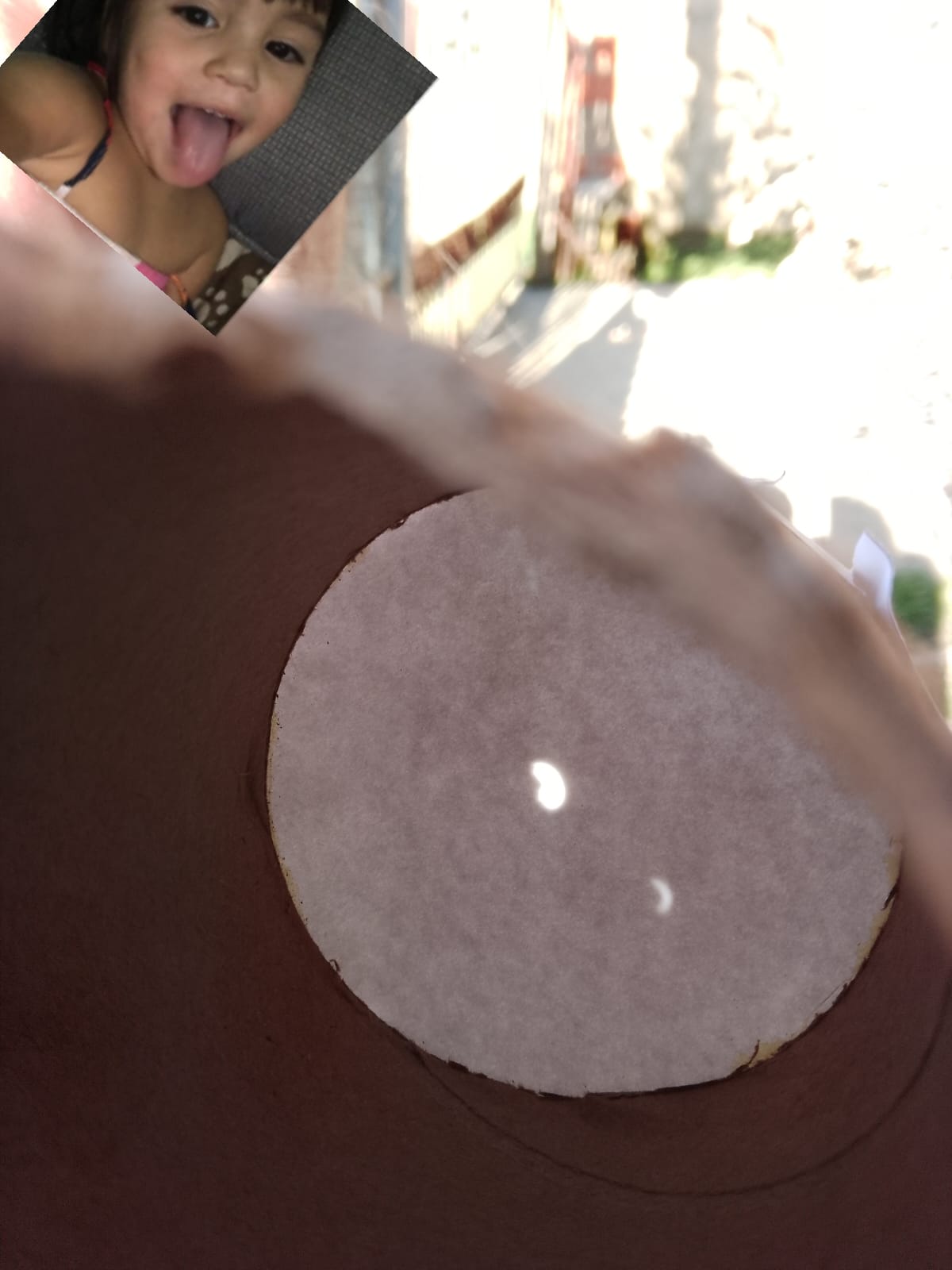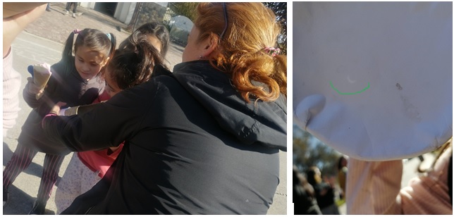 Hola buenas noches, aquí les comparto fotografías de la observación del eclipse, frente a la peatonal de la iglesia de la localidad de El Bolsón, donde se encontraban los chicos y chicas de Osiris. Allí se hicieron presentes los estudiantes de 2° turno mañana , Escuela N° 270. previo a la observación del eclipse, trabajamos en el aula las actividades de la guía, construimos nuestras cámaras oscuras, se fijo el vidrio de soldar sobre un cartón para una mayor seguridad a la hora de manipular el vidrio.