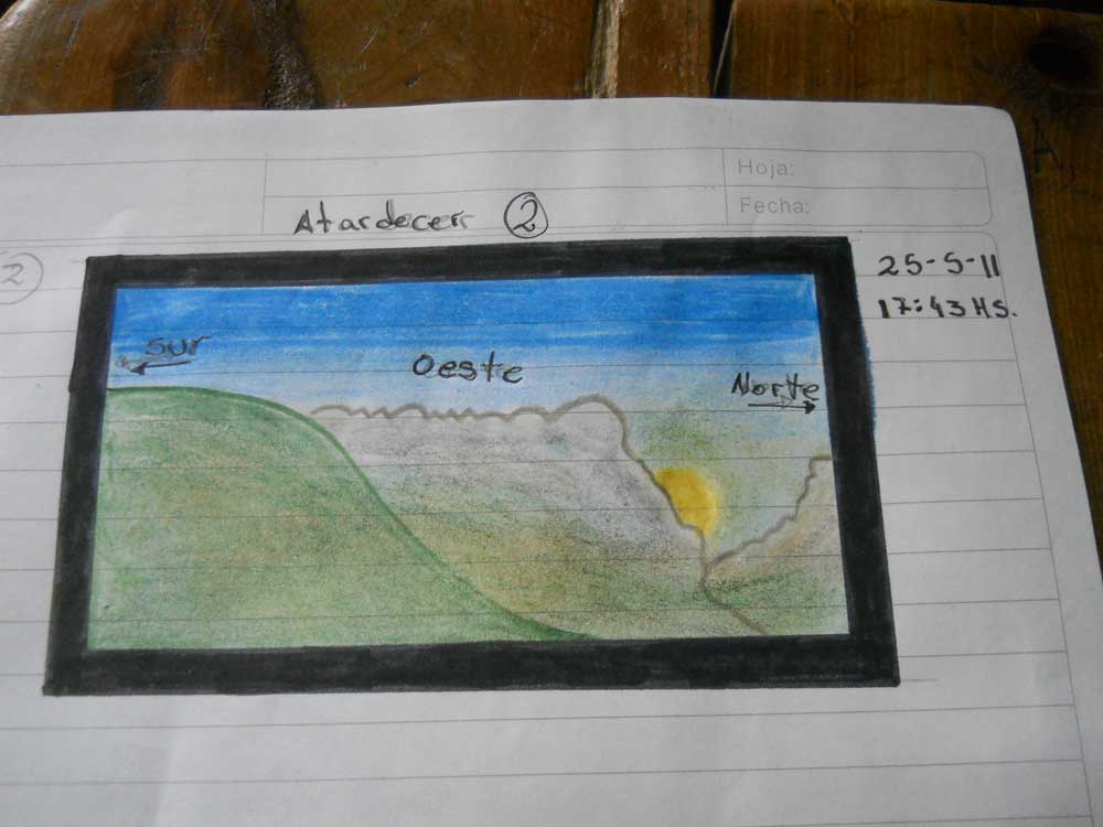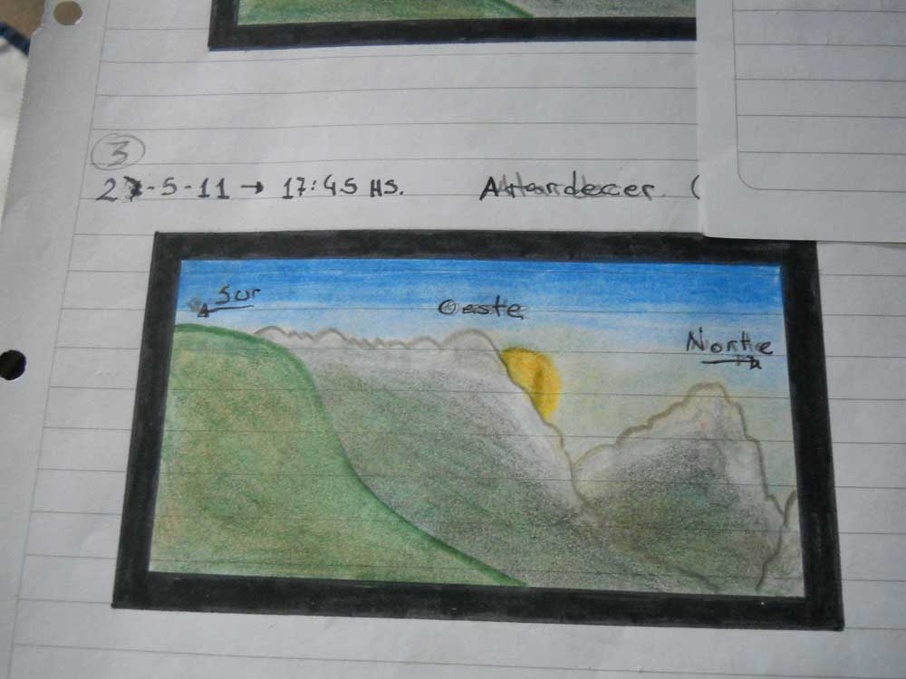 Hola si soy del Nuevos Horizontes Carolina Mavric Como ya comentamos en clase mi registro no estuvo bien echo porque me pude haber parado mal ademas de que era un dibujo y podía no ser exacto el registro.Ademas el movimiento no se podía identificar bien porque ya como dijo Luciano Señorans el sol se movía a "tranco de pollo".Luego de hablar en clase con todos nuestros compañeros pudimos comprender que el sol se movía hacia el norte hasta el solsticio de invierno luego comenzaría a moverse hacia el sur hasta el solsticio de verano.