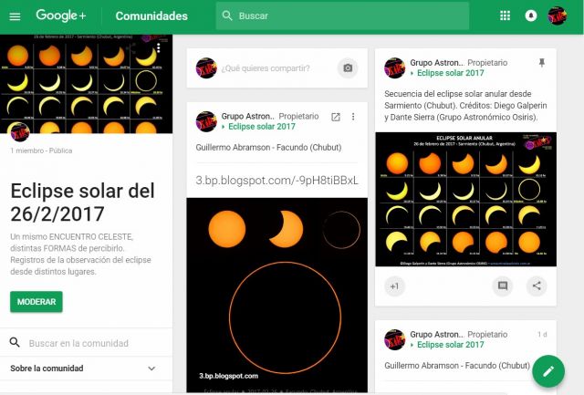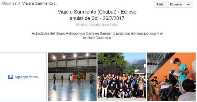 El 26 de febrero de 2017 tuvo lugar un eclipse anular de Sol que pudo ser observado en el sur de la provincia de Chubut. En el resto del país, el eclipse fue parcial. En función de este gran evento astronómico, el Grupo Astronómico Osiris correspondiente al proyecto "Miradas al cielo" (Universidad Nacional de Río Negro e Instituto de Formación Docente Continua de El Bolsón) organizó actividades en la localidad de Sarmiento (Chubut) y viajó hacia allí con un contingente de 30 alumnos y docentes de El Bolsón y Bariloche. Más información sobre el eclipse y sobre el evento en Sarmiento: http://www.miradasalcielo.com.ar/portal/noticia-30-observacion-del-eclipse-solar-anular--2622017.html. A continuación se detallan diferentes registros de lo vivido tanto por gente que viajó a Sarmiento como de personas que tomaron al proyecto "Miradas al cielo" como referencia para acceder a información, para consultar sobre el fenómeno y las actividades y/o para compartir sus experiencias vividas, que fueron realmente intensas.