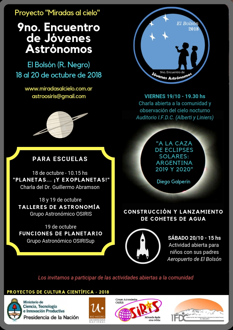 El viernes se desarrollaron funciones de planetario durante todo el día en el Instituto de Formación Docente Continua de El Bolsón a cargo de alumnos de nivel superior del Grupo Astronómico Osiris, de las cuales participaron alumnos de nivel primario de las Escuelas 270, 318 y 372. Simultáneamente, se llevaron a cabo talleres de Astronomía en el mismo Instituto y en la Escuela 271. Por su parte, el día finalizó con la realización de una charla para alumnos de nivel superior y abierta a la comunidad a cargo del Dr. Diego Galperin y, posteriormente, de una observación del cielo a simple vista y con telescopios.